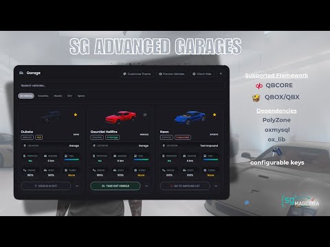 A complete modern solution for managing personal, job-based, and impounded vehicles — built with a fully standalone UI, customizable providers, intelligent image handling, and an immersive preview experience. SG Garage prioritizes reliability, polish, and server performance while giving players and staff powerful tools to manage vehicles effortlessly.
